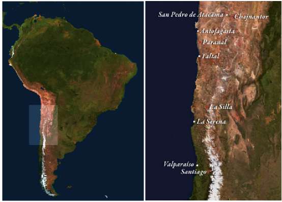 位于南美洲南北向最長(zhǎng)的國(guó)家——智利。右側(cè)是左側(cè)白色陰影區(qū)域的放大圖,可以看到La Silla, Paranal,Chajnantor這三個(gè)臺(tái)站的位置。