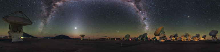阿塔卡馬大型毫米波/亞毫米波陣列由54座12米口徑天線和12座7米口徑天線組成陣列協(xié)同工作,實(shí)現(xiàn)毫米波至太赫茲(1THz)的觀測(cè)。