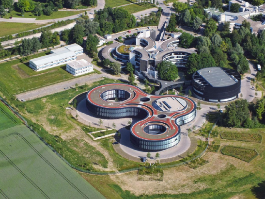 鳥(niǎo)瞰已搬到德國(guó)加興(Garching)的歐南臺(tái)總部,下方的紅色頂建筑和其上方的灰褐色頂建筑為總部主樓,右側(cè)黑色圓形建筑為技術(shù)部建筑。左側(cè)方形建筑則是集裝箱搭建的臨時(shí)建筑,此前的自適應(yīng)光學(xué)部就占據(jù)此小樓。