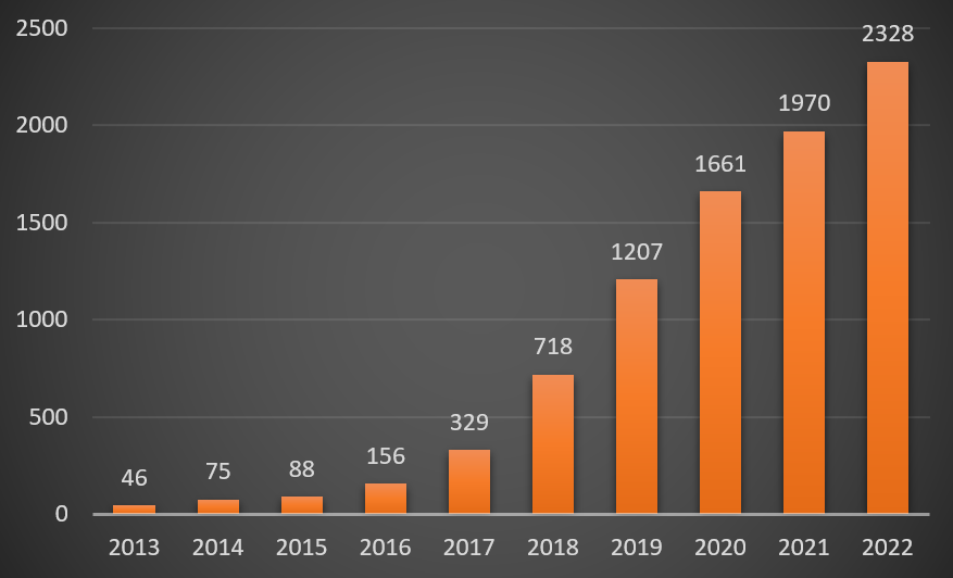 自2011年以來,人工智能(Artificial Intelligence,AI)技術(shù)經(jīng)歷了飛速發(fā)展,成功地跨越了科學(xué)與應(yīng)用之間的技術(shù)鴻溝,在圖像分類、語音識別、知識問答、無人駕駛等方面實現(xiàn)了重大的突破,進(jìn)入了蓬勃發(fā)展的時期。而在天文學(xué)領(lǐng)域,AI的應(yīng)用也在逐年加速增長。通過對arXiv上涉及AI在天文研究方面的論文進(jìn)行統(tǒng)計,發(fā)現(xiàn)從2013年的46篇增長到2022年的2328篇,十年間增長了50倍之多。