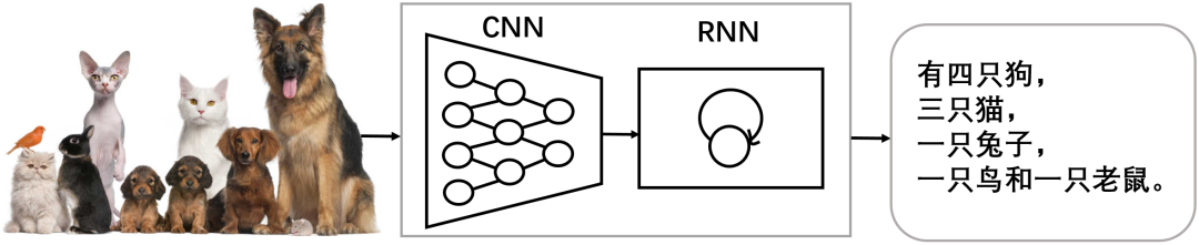 圖5展示了一個圖像描述(image caption)任務(wù)的框架,由卷積神經(jīng)網(wǎng)絡(luò)(CNN)和循環(huán)神經(jīng)網(wǎng)絡(luò)(RNN)構(gòu)成。該模型可以識別圖像中的對象,并用文字描述圖像內(nèi)容,即通過AI模型使計算機(jī)擁有 “看圖說話”的能力。這種任務(wù)涉及到圖像和描述文本兩種不同的信息模態(tài),如何讓AI模型充分利用多模態(tài)信息并進(jìn)行交互,也是未來研究的一個趨勢。