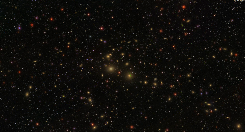如果沒(méi)有暗物質(zhì),星系團(tuán)中的星系由于速度太快會(huì)脫離星系團(tuán)的引力束縛,想象一下流浪地球里面提到的第三宇宙速度(作者注:需要注意的是第三宇宙速度是針對(duì)太陽(yáng)系的, 這里僅用于類比)。星系團(tuán)總質(zhì)量中大概有80%是由暗物質(zhì)貢獻(xiàn)的。觀測(cè)上的星系團(tuán)根據(jù)其內(nèi)部總星系數(shù)目的不同,質(zhì)量范圍大約在1014到幾倍的1015的太陽(yáng)質(zhì)量。圖1的英仙星系團(tuán)的總質(zhì)量大概是2X1015太陽(yáng)質(zhì)量。作為對(duì)比,我們銀河系的總質(zhì)量大概是1012太陽(yáng)質(zhì)量。