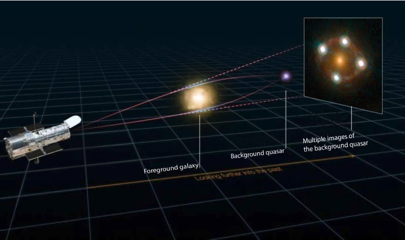 遙遠(yuǎn)類星體發(fā)出的光,在經(jīng)過(guò)前方星系的引力勢(shì)阱的時(shí)候發(fā)生了彎曲,所以光在到達(dá)望遠(yuǎn)鏡的時(shí)候所看到的圖片會(huì)像最右邊圖像所顯示的那樣。(圖源:Martin Millon/Swiss Federal Institute of Technology Lausanne;Hubble Space Telescope/NASA)